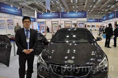 一家韓國公司展示了用碳纖維制造的轎車實物,吸引了不少觀眾駐足觀看。采訪中,公司負責人介紹說,這輛轎車17%的外殼采用碳纖維制造,由于碳纖維強度大,重量輕,使整車車的重量從968公斤降到了385公斤,油耗也大大降低,有利于節能環保。