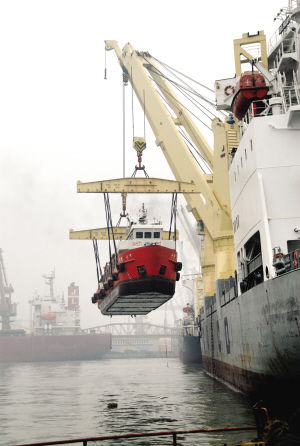 在9艘工程船中,“海豹·二號”是最重的一艘,“體重”達到280噸,為了順利把它吊上“大華”號,天津港二公司選派了經(jīng)驗最豐富的作業(yè)工人,并由生產(chǎn)經(jīng)理親自上到“大華”號的甲板監(jiān)督作業(yè)。記者看到,“海豹·二號”從海面上緩緩升起,越升越高,很快就超過了“大華”號甲板的高度。