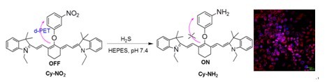 硫化氫 (H2S)是繼NO和CO之后的第三個(gè)氣體信號(hào)分子,可以快速穿過(guò)細(xì)胞膜,對(duì)一系列生物靶點(diǎn)產(chǎn)生作用,兼具細(xì)胞毒性效應(yīng)和細(xì)胞保護(hù)作用。最近,該團(tuán)隊(duì)利用H2S對(duì)硝基的還原性質(zhì),開(kāi)發(fā)出一種含硝基功能團(tuán)的近紅外熒光探針,用于H2S的檢測(cè)。在生理?xiàng)l件下,該探針有效避免了細(xì)胞自發(fā)熒光的影響,在水溶液和活細(xì)胞中均給予了積極的近紅外熒光信號(hào)響應(yīng),還成功拍攝到了活細(xì)胞內(nèi)H2S濃度變化的實(shí)時(shí)圖像(圖1)。參見(jiàn):Chemical Communications, 2012, 48 (96), 11757–11759.