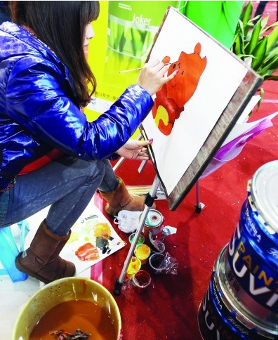 26日,在武漢家裝建材展上,美術專業學生王影倩現場用油漆作畫,吸引了不少市民的關注。王影倩稱:“平時都是用涂料畫畫,用油漆畫,還是第一次。該油漆顏色品種多,沒有異味,健康環保,并不會影響創作�!睍r下家裝材料品種多樣,健康環保的材料日趨成為消費者首選。