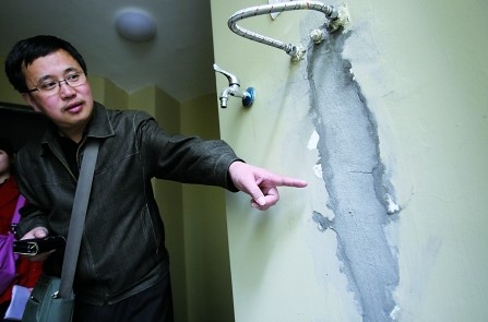進入屋內,記者發現房屋墻面做工相當粗糙,書房、陽臺、走道、廚房等多處墻漆脫落,露出水泥,客廳陽臺和廚房生活陽臺的門也關不嚴。鄒勝中說,今年1月10日,他就接到開發商的接房通知,當他高高興興前來收房時,結果卻令他大失所望,于是拒絕接房,要求開發商整改好后再來接房。
