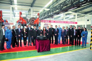 圖為隨著華誼集團(tuán)總裁、雙錢集團(tuán)董事長劉訓(xùn)峰按下按鈕,安徽回力輪胎公司第一條雪地胎順利下線