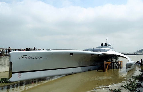 2012年4月10日,廣東珠海,造價1500萬美元的全球最大三體超級豪華游艇“Adastra”號在雞啼門水道的碼頭下水。