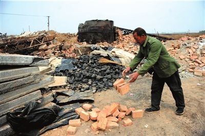 昨天,前宋村一家明膠作坊老板在清理廢墟。問題膠囊事發后,該村40多家明膠作坊被強拆。