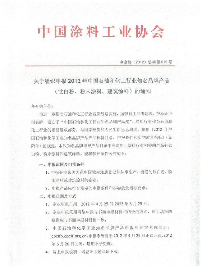 關于組織申報2012年中國石油和化工行業知名品牌產品(鈦白粉、粉末涂料、建筑涂料)的通知