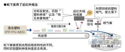 其方法是,用光照射隨著傳送帶移動(dòng)的塑料片,然后對其反射光進(jìn)行分析。利用光吸收特性的不同,識(shí)別PP、PS和ABS三種物質(zhì)。