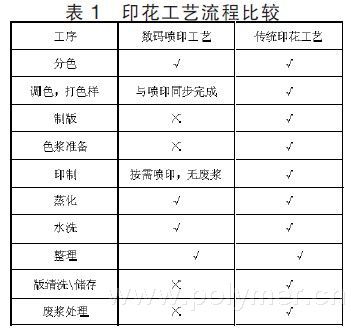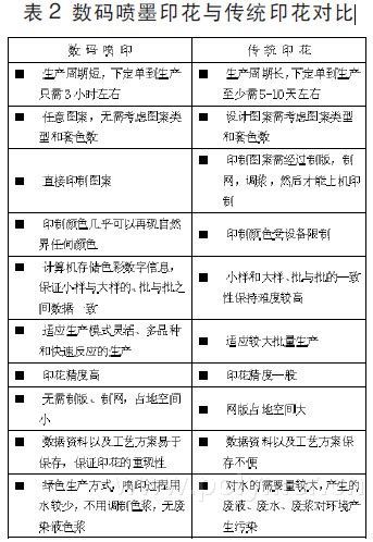 數碼噴墨印花是一種新型印花工藝技術,與傳統印花工藝比較見表1和表2。