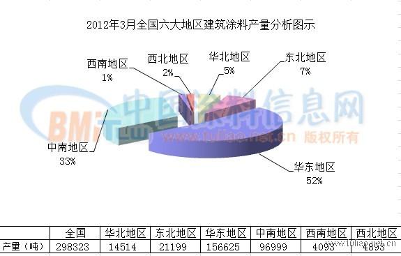 2012年3月全國建筑涂料生產企業212家,本月全國生產建筑涂料298323噸,建筑涂料完成產量最大的地區是華東地區,產量為156625噸,占全國總產量的52%。本月建筑涂料產量依次排序為:華東、中南、東北、華北、西北、西南。完成產量最大的省是上海,產量為73266噸,占全國總產量的24.56%;完成產量最少的省是新疆(內蒙古、西藏、貴州、甘肅、青海、寧夏無產量),產量為15噸,占全國總產量的0.01%。