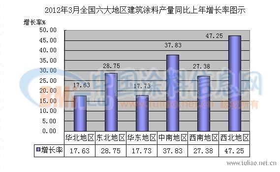 2012年3月全國建筑涂料產量同比上年同月增長率為24.95%,增長率最高的是西北地區,增長率為47.25%。增長率依次排序為:西北、中南、東北、西南、華東、華北。增長率最高的省為黑龍江,增長率為316.15%;增長率最少的省為新疆,增長率下降了76.56%。