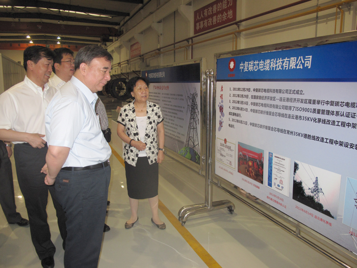 8日,宋志平董事長一行冒雨視察了中復連眾碳芯電纜項目和葉片全尺寸檢測中心。在碳芯電纜試生產車間,中復連眾董事長任桂芳向宋董事長匯報了碳芯電纜項目的進展情況。碳芯電纜具有耐高溫、熱膨脹系數小、耐腐蝕、輸送容量大、線損小等一系列優異性能,是傳統鋼芯鋁絞電纜的更新換代產品,具有很強的經濟效益和社會效益。作為中復連眾今年重點建設項目,碳芯電纜項目已于2月29日奠基,目前各項工作都在緊張有序進行,今年年底一期工程建成投產,預計完全達產后年產復合材料電纜芯及電纜20000千米。試生產已經取得階段性勝利,6月14日和21日,分別在連云港化茅線改造工程和常州市德勝線改造工程中架線安裝,并于當日通電運行。