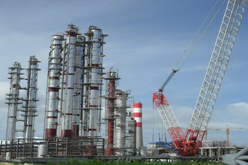這9臺重型塔器設備,總重量900余噸,單臺最高66.8米,是溶劑油裝置的核心設備。為了確保一次順利吊裝成功,四化建公司施工人員精心編制吊裝方案、科學設計吊耳、對塔器附件進行“穿衣帶帽”,采用兩臺超大型履帶吊機吊裝。經過16天努力,施工人員順利完成9臺重型塔器設備的吊裝。