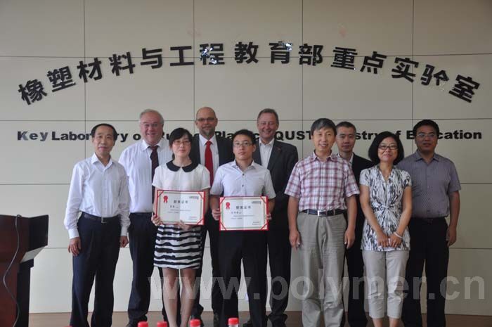 報告結束后,朗盛集團TRP全球研發副總裁Kiersch博士代表朗盛集團向11級材料學研究生劉根海、材料加工工程研究生董霞頒發了朗盛優秀學生獎學金。這兩名同學參加了朗盛專家為青島科技大學高分子專業研究生授課、并通過考試選拔出來的,他們將由朗盛集團全額資助前往德國朗盛總部實習一個月。這一活動已連續三年順利實施,先后有12名同學獲得獎學金前往德國實習。