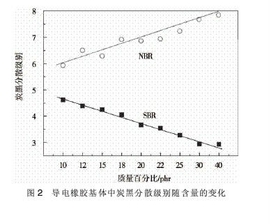 從圖1中可看出,炭黑在橡膠基體中團聚的二次結構在丁腈橡膠中具有更好的分散性能。炭黑的分散會極大地影響導電橡膠的導電行為。