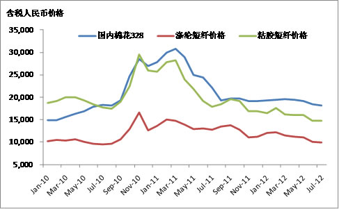 在棉花受到沖擊的同時,滌綸短纖和粘膠短纖由于其價格和技術的發展和優勢,已開始部分取代棉花。