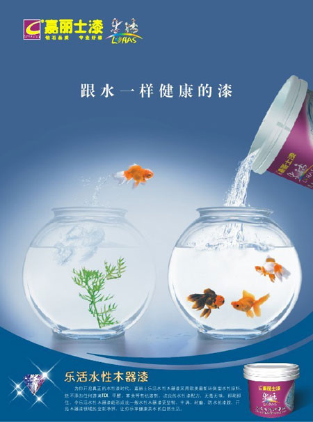 嘉麗士主推的樂活水性漆以環(huán)保稱著,它采用歐美最新環(huán)保型水性丙烯酸聚氨酯分散體等材料配制而成,不含游離 TDI、甲醛、苯類有機溶劑及有毒重金屬等有害物質(zhì),而且無刺激性氣味,對人體無害,即刷即住。樂活水性漆具有耐水、耐磨、耐黃變、耐家用化學(xué)品等功能,漆膜效果豐滿,抗撞擊性優(yōu)異,干燥速度快。在終端推廣樂活水性漆上,安徽安慶嘉麗士以體驗式營銷把樂活水性漆“像水一樣健康”的特點通過直觀的試驗展示給顧客。在裝有金魚的魚缸里,即使放入樂活水性木器漆乳液,金魚依然自由游弋,不受影響,健康看到見。