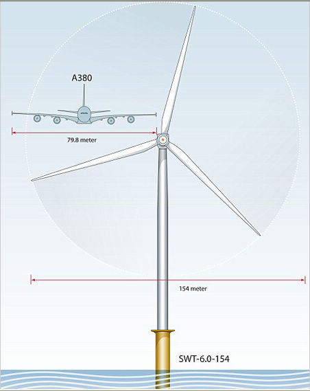 這座風(fēng)力發(fā)電機(jī)的扇葉采用碳纖維制成,是世界上最大的單片玻璃纖維零件。三片扇葉轉(zhuǎn)動起來,覆蓋的面積達(dá)到18600多平方米,相當(dāng)于兩個半足球場的大小。發(fā)電機(jī)擁有6兆瓦的發(fā)電能力,足夠供應(yīng)6000個歐洲家庭用電。