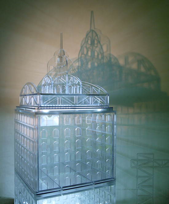 “F城”這件設(shè)計(jì)作品,是現(xiàn)代材料科技與藝術(shù)相結(jié)合的一次大膽嘗試。雖然這不是聚碳酸酯板材第一次應(yīng)用于藝術(shù)創(chuàng)作,但本次設(shè)計(jì)對(duì)于材料性能要求之高、對(duì)加工精細(xì)程度要求之嚴(yán)格,在難度上大大超過以往的藝術(shù)項(xiàng)目。