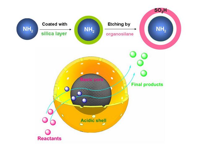 最近,該研究組基于前期的研究進展,通過引入氧化硅犧牲層,實現了不同無機氧化硅層的選擇性溶解,得到具有蛋黃-蛋殼型結構的納米材料。與其它制備方法相比,該方法可以在核或殼的形成過程中可控引入不同的功能基團,從而選擇性地對材料的核或殼進行功能化。基于以上方法,該研究組成功制備了具有堿性核和酸性殼的“蛋黃-蛋殼型”納米反應器,并且通過表征證實了酸、堿基團是分別分布在材料的殼和核上。該納米反應器在Deacetalization– Henry串聯反應中表現出高活性、高選擇性和穩定性。很多具有后修飾潛能的功能基團(-NH2, -SH等)和納米粒子(Pd, Pt等)可以被精確的引入到材料的核或殼中。