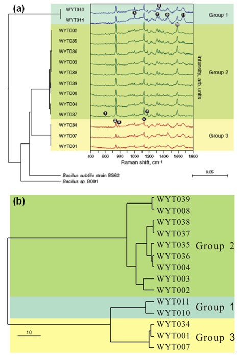 新分離菌株的16S rRNA基因系統發育分析結果(a)與拉曼光譜鑒定結果(b)比較。WYT001-039為所有新分離的芽胞桿菌菌株。