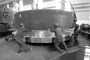 針對(duì)國內(nèi)化工裝備市場(chǎng)持續(xù)低迷、競(jìng)爭(zhēng)激烈、產(chǎn)品毛利潤普遍下的狀況,南化公司化機(jī)廠以創(chuàng)新為驅(qū)動(dòng)力,加大高端裝備研制力度,全方位提升企業(yè)品質(zhì),確保實(shí)現(xiàn)2013年效益考核指標(biāo)。圖為車間職工正在對(duì)乙二醇反應(yīng)器進(jìn)行管板與筒身連接。