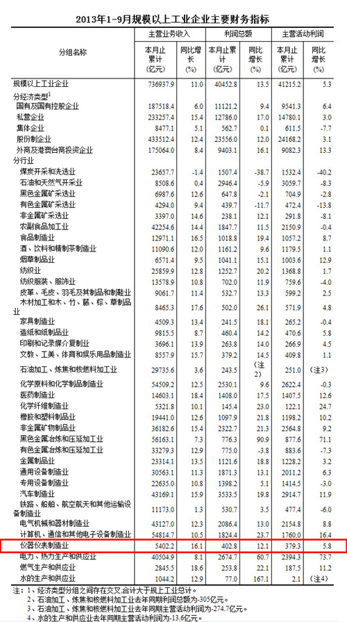 近日,國家統計局公布了“1-9月份全國規模以上工業企業主營活動利潤”數據。1-9月,儀器儀表制造業主營業務收入5402.2億元,同比增長16.1%,在41個行業中,增長率占據前位。實現利潤總額402.8億元,同比增長12.1億元。主營活動利潤379.3億元,同比增長5.8%。