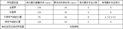浠ヤ笅鏄痙鍥藉湪宸ヤ綔鐜涓紝涓嶅悓綾誨瀷鍛煎惛鍣ㄧ殑浣╂埓鏃墮檺琛細
