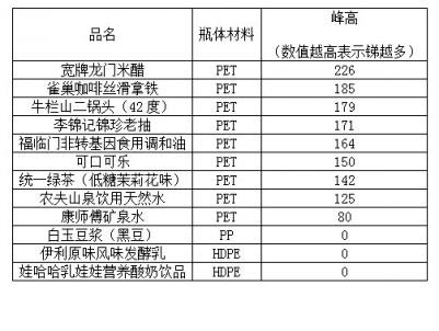 PET瓶體均殘留銻 寬牌龍門米醋瓶體材料殘留最多