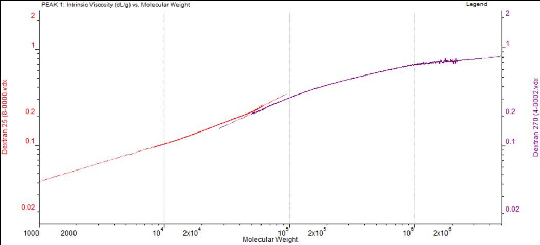 圖3:特性粘度相對于絕對分子量的Mark-Houwink曲線揭示了聚合物的結(jié)構(gòu)信息,在對聚合物進行性能定制時會非常有用