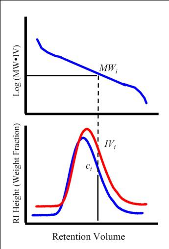 圖2 :為給定的GPC系統(tǒng)制定通用校準曲線,意味著任何聚合物的分子量都可以通過粘度計和RI數(shù)據(jù)得到可靠的確定