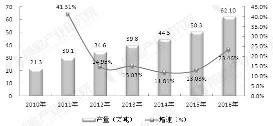 2010-2016騫達紝鎴戝浗PC鏉愭枡浜ч噺閫愬勾澧為暱錛屽閫熶繚鎸佸湪11%浠ヤ笂銆?011騫達紝鎴戝浗PC浜ч噺涓?0.1涓囧惃錛屽悓姣斿闀?1.31%錛屼負榪戝勾鏉ユ渶楂樺閫燂紱2016騫翠駭閲忓闀垮埌62.10涓囧惃錛屽悓姣斿闀?3.46%銆?