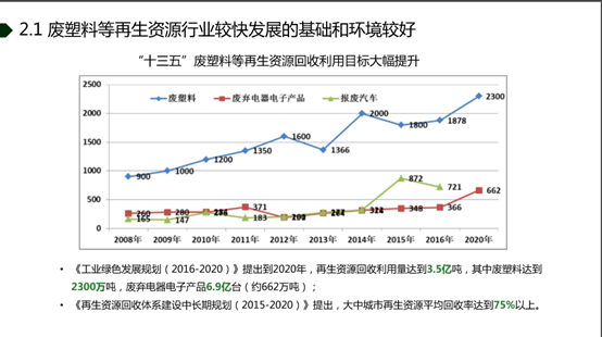 銆婂伐涓氱豢鑹插彂灞曡鍒?2016-2020)銆嬫彁鍑猴紝鍒?020騫達紝鍐嶇敓璧勬簮鍥炴敹鍒╃敤閲忚揪鍒?.5浜垮惃錛屽叾涓簾濉戞枡杈懼埌2300涓囧惃錛屽簾寮冪數鍣ㄧ數瀛愪駭鍝?.9浜垮彴(綰?62涓囧惃)銆傚彟澶栵紝銆婂啀鐢熻祫婧愬洖鏀朵綋緋誨緩璁句腑闀挎湡瑙勫垝(2015-2020)銆嬫彁鍑猴紝澶т腑鍩庡競鍐嶇敓璧勬簮騫沖潎鍥炴敹鐜囪揪鍒?5%浠ヤ笂銆?