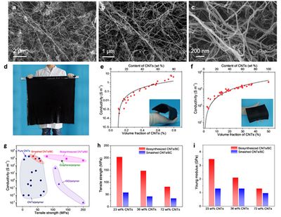錛坅-c錛夌⒊綰崇背綆?緇嗚弻綰ょ淮绱犲鍚堟潗鏂欐壂鎻忕數(shù)闀滅収鐗囷紝鍦ㄤ笉鍚屽昂搴︿笅錛岀⒊綰崇背綆′笌綰崇背綰ょ淮绱犲潎鍖緙犵粫鍒嗗竷銆傦紙d錛夊鍚堟潗鏂欑殑澶ц妯″埗澶囷紙800×800×0.8 mm3錛夈傦紙e, f錛夊鍚堟潗鏂欐皵鍑濊兌錛坋錛夈佽杽鑶滐紙f錛夌殑紕崇撼綾崇鍚噺涓庣數(shù)瀵肩巼鍏崇郴鏇茬嚎錛屾彃鍥句負(fù)鏁扮爜鐓х墖銆傦紙g錛夊鍚堟潗鏂欒杽鑶滀笌鏂囩尞鎶ラ亾鐨勫悓綾繪潗鏂欏己搴︿笌鐢?shù)瀵肩巼瀵规瘮銆傦紙h, i錛夌敓鐗╁悎鎴愭硶鍒跺鐨勫鍚堟潗鏂欒杽鑶滀笌嫻嗘枡娉曟牱鍝佺殑寮哄害涓庢ā閲忓姣斻?
