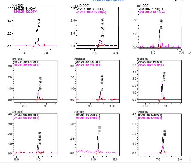 鍥?.LCMS-8050鍒嗘瀽涓嵂鏉愬熀璐ㄥ姞鏍囧啘鑽粍鍒哅RM鍥?(鍔犳爣嫻撳害1.0~5.0渭g/kg)