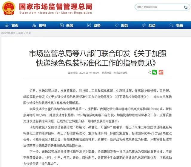 榪戞棩錛屽競鍦虹洃綆℃誨眬銆佸彂灞曟敼闈╁銆佺鎶閮ㄣ佸伐涓氬拰淇℃伅鍖栭儴銆佺敓鎬佺幆澧冮儴銆佷綇鎴垮煄涔″緩璁鵑儴銆佸晢鍔¢儴銆佸浗瀹墮偖鏀垮眬絳夊叓閮ㄩ棬鑱斿悎鍗板彂銆婂叧浜庡姞寮哄揩閫掔豢鑹插寘瑁呮爣鍑嗗寲宸ヤ綔鐨勬寚瀵兼剰瑙併嬶紙浠ヤ笅綆縐般婃剰瑙併嬶級錛屾彁鍑哄埌2022騫村勾搴曞墠錛屽埗瀹氬疄鏂藉揩閫掑寘瑁呮潗鏂欐棤瀹沖寲寮哄埗鎬у浗瀹舵爣鍑嗭紝鍩烘湰寤虹珛瑕嗙洊鍏ㄩ潰銆侀噸鐐圭獊鍑恒佺粨鏋勫悎鐞嗙殑蹇掔豢鑹插寘瑁呮爣鍑嗕綋緋匯?