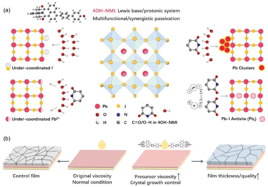 鏈伐浣滃皢璺槗鏂⒈瀹樿兘鍥笌璐ㄥ瓙瀹樿兘鍥簬鑱氳姵棣欏叡杞垎瀛愪笂榪涜浜嗙粍鍚堬紝寰楀埌浜嗙函璺槗鏂⒈浣撶郴鍒嗗瓙9CN-PMI涓庤礬鏄撴柉紕?/span>/璐ㄥ瓙浣撶郴鍒嗗瓙4OH-NMI錛屽茍灝嗗叾寮曞叆鍒伴挋閽涚熆鍓嶉┍浣撴憾娑蹭腑錛屽埗澶囧緱鍒頒簡閽濆寲涔嬪悗鐨勯挋閽涚熆钖勮啘涓庡櫒浠躲傞氳繃瀵逛袱縐嶄笉鍚岀被鍨嬪垎瀛愮殑琛ㄥ緛瀵規瘮錛岃瘉鏄庝簡鍏鋒湁璺槗鏂⒈/鑱氳姵棣欏叡杞?/span>/璐ㄥ瓙緇撴瀯鐨勫垎瀛?/span>4OH-NMI鑳藉璧峰埌鏇村姞浼樺紓鐨勫寲瀛﹂挐鍖栵紙Chemical passivation錛変綔鐢紝鍏舵墍鎷ユ湁鐨?/span>C=O/-OH瀹樿兘鍥綋緋諱笉浠呰兘澶熸湁鏁堥挐鍖栨璐熺數鑽風己闄蜂笌閾呭洟綈囷紝閽濆寲鍓傜殑-OH鍙互閫氳繃姘㈤敭涓?/span>I-鐩鎬簰浣滅敤錛屼粠鑰屼績榪?/span>C=O鍩哄洟涓庡弽浣?/span>Pb2 緙洪櫡鐨勭浉浜掔粨鍚堬紝浣垮緱閽濆寲鏁堟灉鏈澶у寲銆備笌姝ゅ悓鏃訛紝鏈枃閫氳繃鐞嗚璁$畻涓庣ǔ瀹氭ф祴璇曪紝璇佹槑浜?/span>4OH-NMI鍏鋒湁鏇村姞鏄捐憲鐨勮兘甯﹂挐鍖栵紙Energetic passivation錛変綔鐢紝鍗抽挐鍖栧垎瀛愪駭鐢熻壇鎬х殑涓棿鑳介殭鎬侊紝璇ヨ兘闅欐佷綅浜?/span>O2浜х敓鐨勭數瀛愰櫡闃辨佷箣涓婏紝鑳藉鎶㈠湪O2涔嬪墠鎹曡幏閽欓挍鐭夸笂鐨勫厜嬋鍙戠數瀛愶紝閬垮厤瓚呮哀紱誨瓙鐨勫艦鎴愶紝榪涜屾彁楂橀挋閽涚熆鍣ㄤ歡鐨勭ǔ瀹氭с傛澶栵紝鏈枃鎰忓鍦板彂鐜?/span>4OH-NMI涓?/span>9CN-PMI鐨勫姞鍏ュ彲浠ユ彁楂橀挋閽涚熆鍓嶉┍浣撴憾娑茬殑綺樺害錛屼粠鑰屾樉鐫澧炲姞閽欓挍鐭胯啘鐨勫帤搴︿互瀹炵幇鏇撮珮鐨勫厜鏀墮泦鏁堢巼銆傛渶緇?/span>4OH-NMI閽濆寲鍚庣殑閽欓挍鐭跨數姹犳晥鐜囬珮杈?/span>23.7%涓旇〃鐜板嚭浼樺紓鐨勭ǔ瀹氭с?/span>
