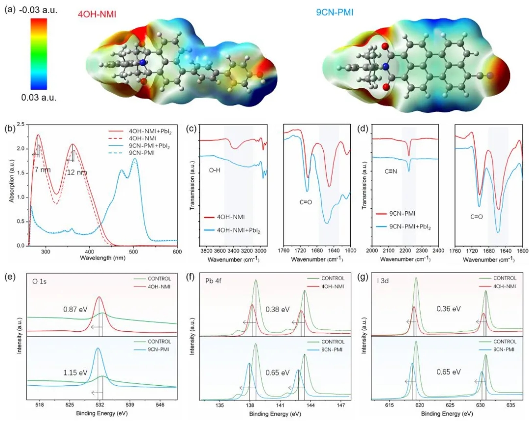 鍥?. a錛?4OH-NMI鍜?span style="font-family:Calibri;">9CN-PMI鐨勮〃闈㈤潤鐢靛娍鍒嗗竷鍥俱?span style="font-family:Calibri;">b錛?4OH-NMI/DMF銆?span style="font-family:Calibri;">9CN-PMI/DMF銆?span style="font-family:Calibri;">4OH-NMI/PbI2/DMF鍜?span style="font-family:Calibri;">9CN-PMI-PbI2/DMF婧舵恫鐨勭傳澶?span style="font-family:Calibri;">-鍙鍚告敹鍏夎氨銆?span style="font-family:Calibri;">c- d錛夊尯鍩熸斁澶х殑FTIR鍏夎氨錛?span style="font-family:Calibri;">c錛?span style="font-family:Calibri;">4OH-NMI綺夋湯鍜?span style="font-family:Calibri;">4OH-NMI/PbI2綺夋湯錛宒錛?span style="font-family:Calibri;">9CN-PMI綺夋湯鍜?span style="font-family:Calibri;">9CN-PMI/PbI2綺夋湯銆傚弬姣旇杽鑶溿?CN-PMI閽濆寲钖勮啘鍜?span style="font-family:Calibri;">4OH-NMI閽濆寲钖勮啘鐨?/span>O 1s錛?span style="font-family:Calibri;">e錛夈?/span>Pb 4f錛?span style="font-family:Calibri;">f錛夊拰I 3d錛?span style="font-family:Calibri;">g錛夊嘲鐨?span style="font-family:Calibri;">XPS璋便?/span>
