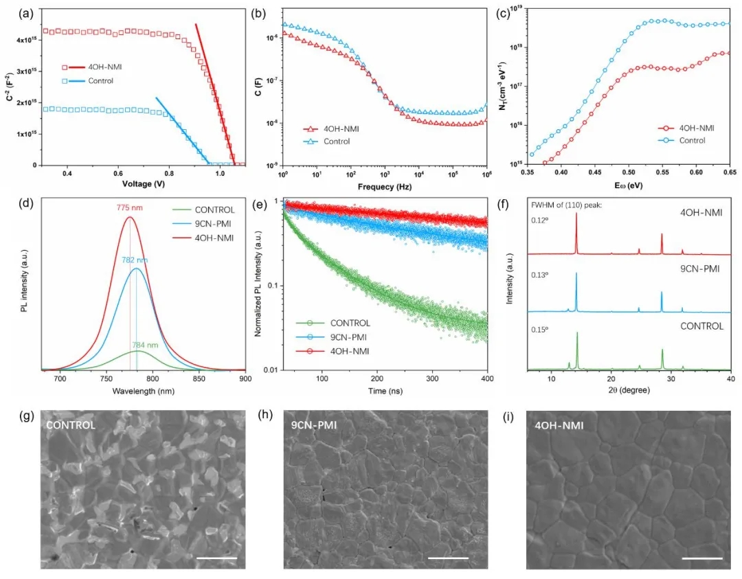 鍥?. 錛坅-c錛?span style="font-family:Calibri;">4OH-NMI閽濆寲鍣ㄤ歡鍜屽弬姣斿櫒浠剁殑鐑綰沖厜璋辯浉鍏蟲祴璇曪紙TAS錛夛細a錛?鑾壒-鑲栫壒鍩哄浘錛?span style="font-family:Calibri;">b錛夌數瀹?span style="font-family:Calibri;">-棰戠巼鍏崇郴鍥撅紝c錛夎綆楀緱鍒扮殑闄烽槺鎬佸瘑搴︼紙NT錛夈俤錛?ss-PL鍏夎氨錛堥挋閽涚熆/FTO/鐜葷拑錛夛紝e錛?span style="font-family:Calibri;">tr-PL鍏夎氨錛堥挋閽涚熆/SiO2鐜葷拑錛夛紝f錛?span style="font-family:Calibri;">XRD鍥捐氨銆傦紙g-i錛夊悇縐嶇被钖勮啘鐨勬壂鎻忕數瀛愭樉寰暅錛?span style="font-family:Calibri;">SEM錛夊浘鐗囷紝姣斾緥灝?span style="font-family:Calibri;">2 mM銆?/span>