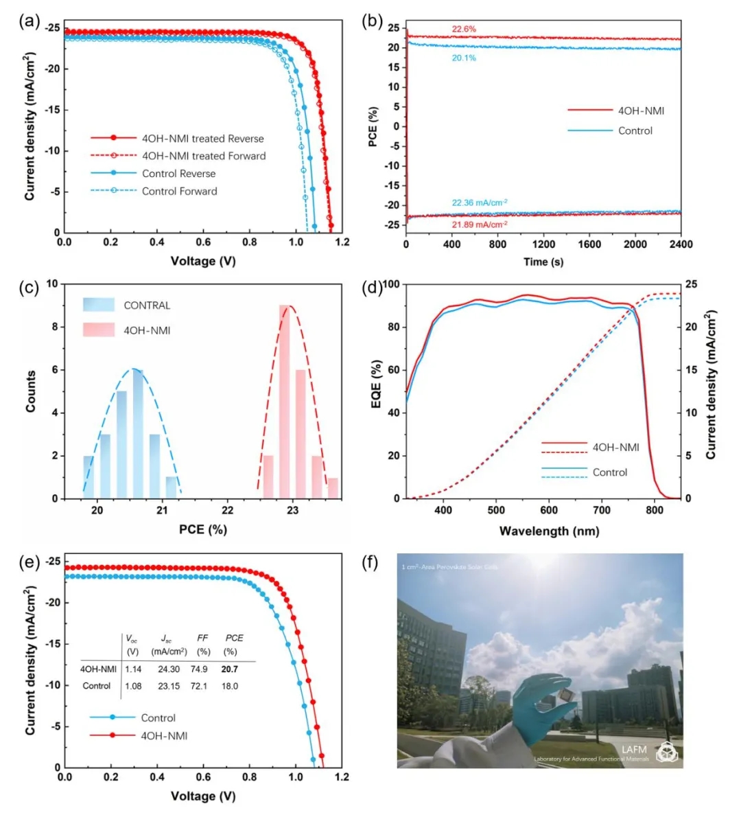 鍥?/span>4. a錛?鍙傛瘮鍣ㄤ歡涓?span style="font-family:Calibri;">4OH-NMI閽濆寲鍣ㄤ歡鐨凧-V鏇茬嚎錛?span style="font-family:Calibri;">b錛変笂榪頒袱縐嶅櫒浠剁殑鏈澶у姛鐜囩偣鐨勭ǔ瀹氭渶澶у姛鐜囪緭鍑猴紙鍙傛瘮鍣ㄤ歡涓?span style="font-family:Calibri;">0.92 V錛?span style="font-family:Calibri;">4OH-NMI閽濆寲鍣ㄤ歡涓?span style="font-family:Calibri;">1.01 V錛夛紝c錛?span style="font-family:Calibri;">PCE鍒嗗竷緇熻鍥撅紝 d錛?span style="font-family:Calibri;">EQE鍏夎氨銆?span style="font-family:Calibri;">e錛夋湁鏁堥潰縐負1 cm2鐨勫弬姣斿櫒浠跺拰4OH NMI閽濆寲鍣ㄤ歡鐨勫弽鎵?span style="font-family:Calibri;">J-V鏇茬嚎銆?span style="font-family:Calibri;">f錛夋湁鏁堥潰縐負1 cm2鐨勭數姹犵収鐗囥?/span>