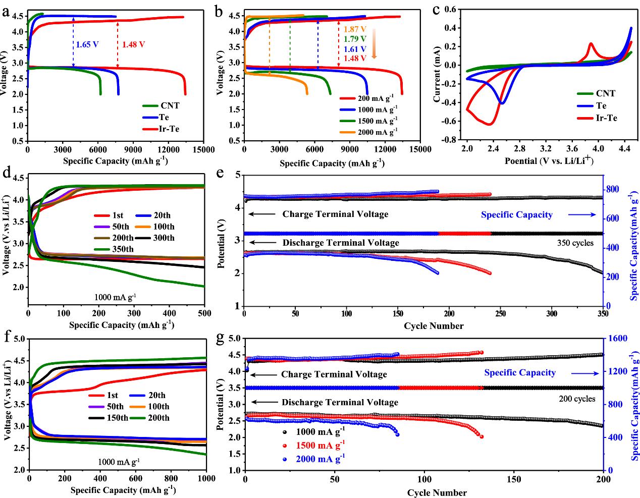 鍥?/span>3 (a)鎴數鍘嬪厖鏀劇數瀹歸噺瀵規瘮鍥?/span> (b) 鍊嶇巼鎬ц兘瀵規瘮鍥?/span> (c)寰幆浼忓畨鍥俱傦紙d-g錛堿tomic Ir-Te 鍌寲鍓傛埅瀹歸噺涓?/span>500 mAh g-1 鍜?/span>1000 mAh g-1鐨勫驚鐜姣斿浘銆?/span>