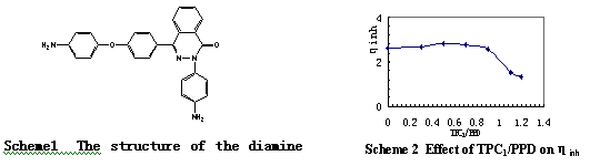 DAPE+TPC2時(shí),改變TPC1/PPD的量,對(duì)聚合物的特性粘度、反應(yīng)合成規(guī)律、尤其是助溶劑鹽LiCl用量、聚芳酰胺熱穩(wěn)定性能、溶解性能和力學(xué)性能等都產(chǎn)生不同程度影響。Scheme2列出了TPC1/PPD對(duì)于ηinh值的影響。通過(guò)研究,可進(jìn)行分子結(jié)構(gòu)設(shè)計(jì)、聚合物序列以及聚合物分子量的控制。![]() |