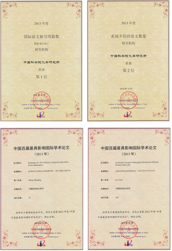 �п�Ժ���W����ƪՓ��Realizing over 10% efficiency in polymer solar cell by device optimization (Science China-Chemistry, 2015, 58, 248-256) ��An electron acceptor challenging fullerenes for efficient polymer solar cells (Advanced Materials, 2015, 27, 1170-1174)���x���Ї���ƪ���Ӱ푇��H�W�gՓ�ġ���
