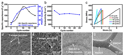 �D1 ��ͬ��Ȧ���r���ͺϱ�Ĥ���������PEDOT����(a)��늌���(b)�͑���-��׃����(c)����̼�{�ܱ�Ĥ(d)�͏ͺϱ�Ĥ(e)SEM�D��̼�{�ܱ�Ĥ(f)�͏ͺϱ�Ĥ(g)TEM�D��