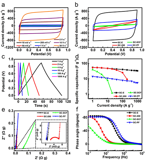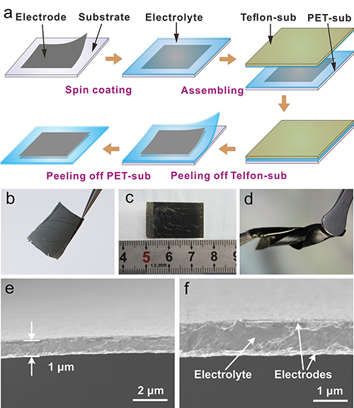 ��������ֱ�����L��̼�{�ܱ�Ĥ�cPEDOT�M�Џͺϣ�������ؓ�d����늻��W�����M�Ѓ����������ڴ�����Y�ͽY�����ɵ��B�m�W�j�Y����ԓ�ͺϱ�Ĥ���и��_~1600 S cm-1��늌��ʺ�~300 MPa�����W���ȣ�������Ƥ�w�������Ę������D1�������һ�N�����r�ױ����ܲ�ķֲ����x���g�����F���������r�ğo�p���x����������ȼs��1 ��m�ij����������D2�������yԇ���@�NƤ�w�ͳ���������ı���ݞ�56 F g-1�������ڃ�늘O�|�����������ܶȞ�6.0 W h kg-1�������ܶȞ�332 kW kg-1��푑��r�g��5.4 ms����������߀������105�εď��ۡ�������������Ĥ������ԓƤ�w�ͳ���������ڱ�������������ܶȡ�푑��r�g�Ͼ��w�F���@�����ݣ��D3�����������������Կɴ�����ӌW��Ƥ�w��ӌW���I�D4����