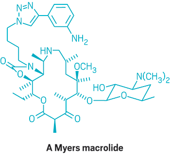 �����W(xu��)Andrew G. Myers�о�С�M�Ļ��W(xu��)������������ȫ�ϳɵķ��������Ӵ�h(hu��n)��(n��i)���ˎ��Ĕ�(sh��)��(�c����xԔ��(x��))����h(hu��n)��(n��i)��������Ǻ���14��16��̼ԭ�ӵĴ�h(hu��n)�������tù�غͰ���ù�أ�Myers���˵ġ��eľʽ������ʹ�������܉��Ƃ�֮ǰ�y�ԫ@�õĴ�h(hu��n)��(n��i)������Myers�ѽ�(j��ng)������һ������Macrolide Pharmaceuticals�Ĺ�˾����Ŀǰ��ֹ��ʹ��ԓ����ȫ�ϳ��˽�1,000�N��h(hu��n)��(n��i)�����������S�������m����Բ�ԭ�w����ǰ��δҊ�Ļ�����������Ŀǰʹ�õĎN��������ˎ�Ĵ��c�U���Ϳ��ײ�����