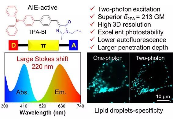 �����n�}�Mǰ�ڵ�֪�R�ͽ��e�ۣ��ڽ��ڵĹ����У��Ʊ���Ժʿ�n�}�M�OӋ��һ�NAIE̽ᘣ���TPA-BI������֬�ε��p���ӳ���TPA-BI���Ӳ��ù��w-��-���w��donor-��-acceptor��D-��-A���ĽY�����������������H�Ǐ���ӹ��w��ͬ�r߀�Ǻܺõ��p���ӷ��Ә�����Ԫ����BI���քt��AIE�Ę�����Ԫ�������A�ڣ�D-��-A�Y����TPA-BI���ڴ���Ť�����Ӄȵ�늺��D�ƣ�TICT�������F�������܄���Ч�����ڷǘO�ԭh���ɹ��{�����������Ԍ��F��֬�ηǘO�ԭh�����خ���푑���TPA-BIҲ���F��AIE��������˹�п�˹λ�ƿ��_202 nm��TPA-BI����410 nm�Ćι��Ӽ��l��ͬ�rҲ����840 nm�M���p���Ӽ��l�����p�������ս�����_213 GM������C��TPA-BI�dz��m���ڸ��N���ϵ�̶��M����Ƭ�е��p���ӳ����AIE���p�����ڳ����ϵă��c�������̘IȾ�ϡ��@һ�ɹ����ڰl����Chemical Science �ϣ����µĵ�һ��������ۿƼ���W�IJ�ʿ�о������������ǹ�ʿ��