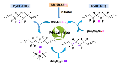 ���ˏĸ����Ͻ�Q�@һ�y�}���������־�ɽ��ڈF(tu��n)�(du��)������˃ɷN�o���م��c�ľGɫ�仯�wϵ���Ƃ�P(VDF-TrFE) ��P(VDF-TrFE-CTFE)���D1.2d��ʾ�������������������������飨(Me3Si)3)SiH������TTMSS���������ɻ�߀ԭԇ���仯P(VDF-CTFE)���·���������(Me3Si)3)Si*�CTFE��Ԫ�е�C-Cl�I�����ھۺ���������ԭλ����һ��(g��)���ɻ��������c�µĹ����M(j��n)�����ɻ����D(zhu��n)�ƣ�����һ��(g��)TrFE��Ԫ���µ�(Me3Si)3)Si*�M(j��n)����һ��(g��)ѭ�h(hu��n)���D2��������(y��ng)�^����P(VDF-CTFE)�c������Ԍ�(sh��)�F(xi��n)��Ħ���Ț仯������(y��ng)�l���غͣ����ڴ����(sh��)���܄��кܺõ��M(j��n)�С�ԓ�����l(f��)����J. Mater. Chem. C., 2017, 5, 6433�ϣ���һ���ߞ�Tʿ��������ͬ�W(xu��)��ԓ���±������x��Hot paper��