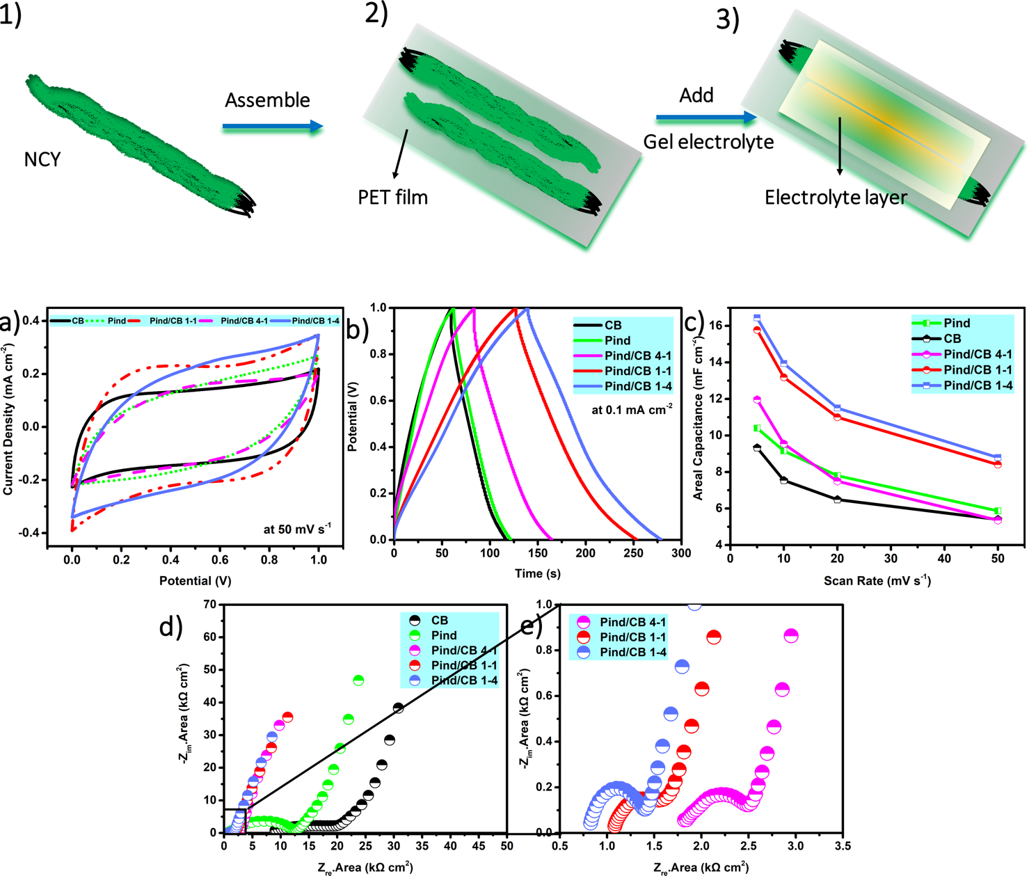 a) ��ͬ��ȵľ�����/̿�ڏͺϼ{���w�S��늵�CV�D��b) GCD�D��c) �ڲ�ͬ���������µı���ݣ�d-e) EIS�D