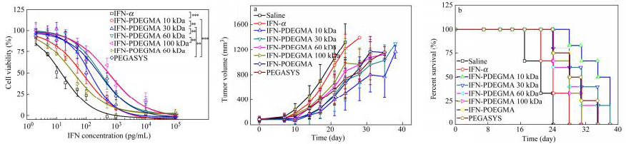 �ؽM�˸ɔ_�ئ�(interferon-��, IFN-��)��һ�N�dz���Ҫ��ˎ�õ��ף�Ŀǰ�ڸ��N�����Լ����Ͱ��Y�ί��ϣ������F���˃������ί�Ч������������w��ѭ�h��˥���^�̣�������ˎЧ���w�ȵij�ְl�]�����l��ע���֕������صĶ������ú���ˎ�ԡ���֮ǰ���о��У����lƽ�����n�}�M������Ե������ں�(ELPfusion)�Ͷ��cԭλ���L(site-specific in situ growth, SIG)�ķ������քe�ϳ���IFN-ELP��IFN-POEGMA��IFN-PMPC��ż��^�õ������IFN�İ�˥�ڡ������@Щ�о��У���ͨ�^�o�}ע��ķ�ʽ������С���M���ί���ˎ������в�����ȫ�������[���M��������Mһ�����ˎ��������[���M���ĸ��������Ǹ����ί�Ч��ͬ�r���Ͷ������õ��P�I��