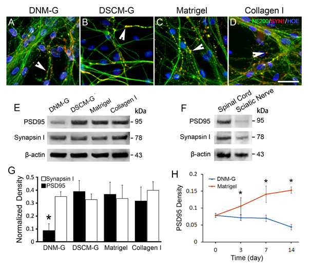 ���գ���ɽ��W(xu��)ȫ��Ƽ���ں����@ɽ���ڈF(tu��n)�(du��)(li��n)�ψ�(b��o)����һ�Nȥ��(x��)����(j��ng)���|(zh��)ˮ���z������Decellularized nerve matrix-gel��DNM-G���߂��m���܇���(j��ng)�M�������Ĺ����خ��ԡ����i��������(j��ng)��ԭ���ϣ���(j��ng)���W(xu��)Ó��(x��)����ø�������ֶ�̎�����Ƃ������ˮ���z��Ҫ������������(j��ng)��(x��)������|(zh��)��extracellular matrix��ECM���ɷݡ�ͨ�^(gu��)�cȥ��(x��)�������(l��i)Դ�Ļ��|(zh��)ˮ���z��decellularized spinal cord matrix-gel��DSCM-G)���[���M��ECM��(l��i)Դ��ˮ���z��Matrigel���Լ�I ���zԭ��collagen I�����^��l(f��)�F(xi��n)��DNM-G�܉��خ����T��(d��o)�w�����B(y��ng)��ʩ�f(w��n)��(x��)�������Sͻ�w�����в������Sͻ���Ķ����M(j��n)�Sͻ���ʻ�����һ���棬DNM-G�܉�����ͻ�|��ɷ�-PSD95�ı��_(d��)�Ķ�����ͻ�|�γɡ��@Щ�Y(ji��)�����F(xi��n)�����@���܇���(j��ng)���������������(l��i)Դ��ˮ���zDSCM-G�mȻҲ�ܴ��M(j��n)ʩ�f(w��n)��(x��)���N���Sͻ����ʩ�f(w��n)��(x��)�������Sͻ�ķ�ʽ������Ɵo(w��)����(j��ng)�w�S������DSCM-G�܉�ܺõ�֧���w�����B(y��ng)DRG��(j��ng)Ԫ�֮�g�γ�ͻ�|���@Щ��������И���(j��ng)���������c(di��n)���D1����