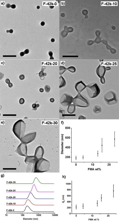 �D6��PDMA-b-P(BzMA-co-FMA)-42k-x(x = 0,10,20,25,30)���ݵ�TEM��DLS�����Y����